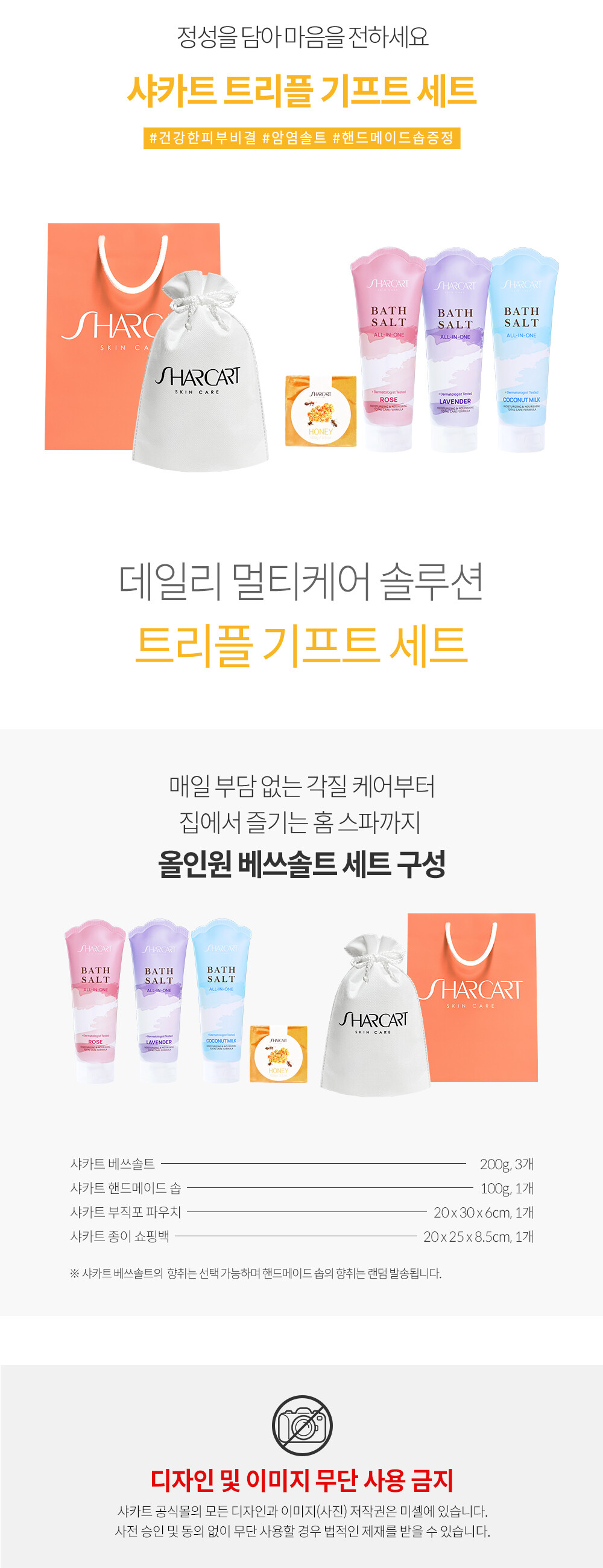 구성: 베쓰솔트 200g 3개(향 선택) + 솝 100g 1개(향 랜덤) + 부직포 파우치 + 종이 쇼핑백